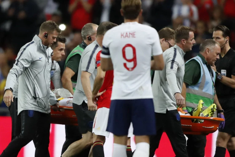 Foto: Tanjug/APKarvahal i Šo su bili u duelu početkom drugog poluvremena na utakmici Lige nacija kada je Englez pao ko pokošen i ubrzo je iznet na nosilima sa terena.