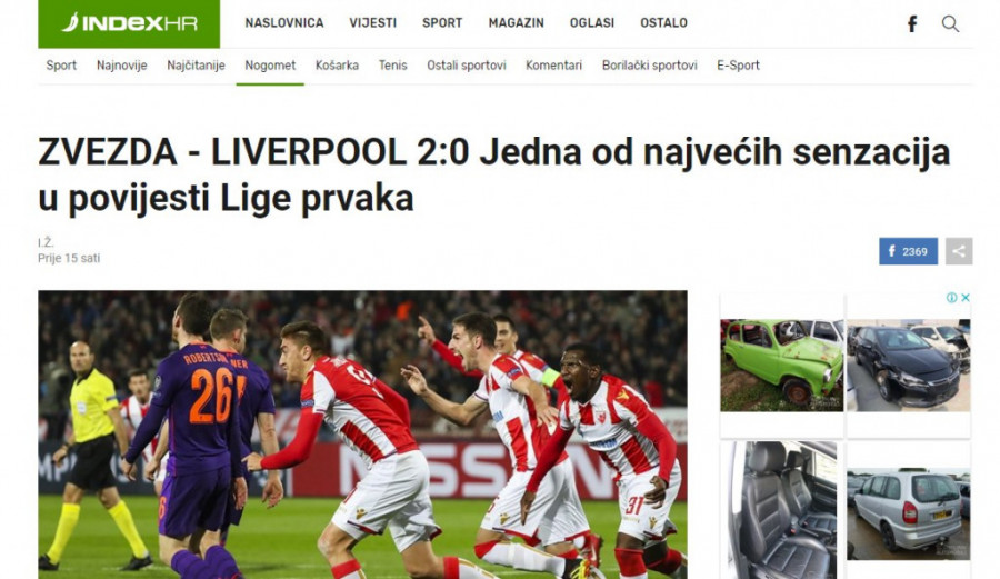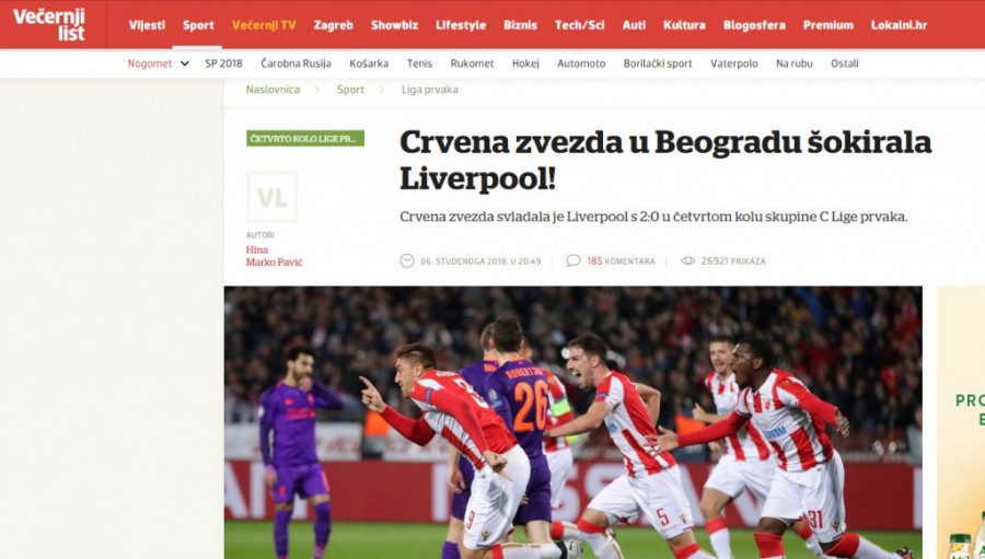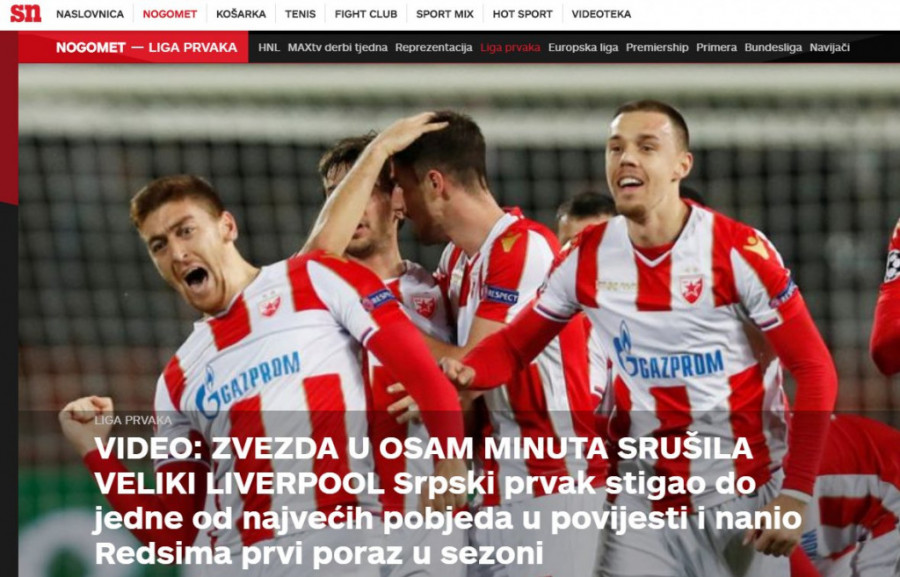 - Crvena zvezda je priredila pravi spektakl protiv Liverpula pred oko 55.000 navijaca na užarenoj "Marakani". Srpski prvak razbio je prošlogodišnjeg finalistu Lige šampiona i ostvario pobedu 2:0. Zvezda je tako došla do najveće pobede u svojoj istoriji od raspada bivše Jugoslavije - navodi Indeks, a onda široko nastavlja čitavu priču sa izjavama aktera, o atmosferi na stadionu, ali i velikim novcem koji je Zvezda zaradila ove sezone (oko 25 miliona).