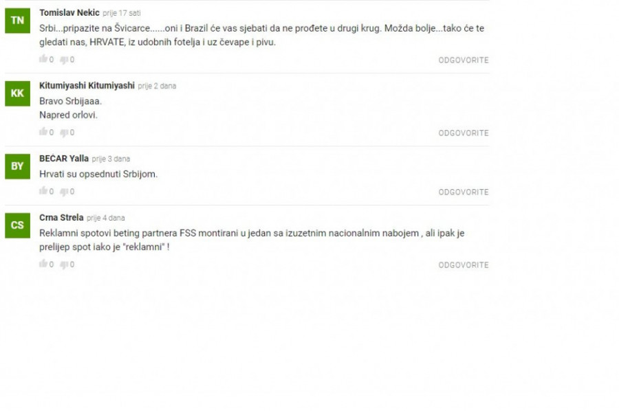 "Bravo Srbija! Napred Orlovi!", "Svaka čast na spotu, odličan je", "Dobar, dobar".