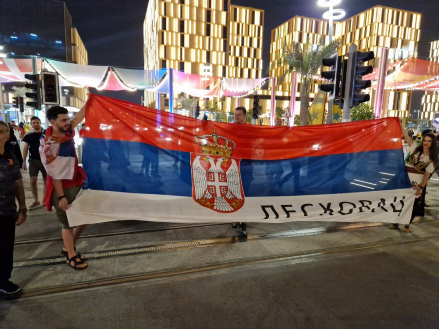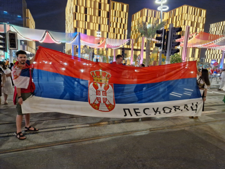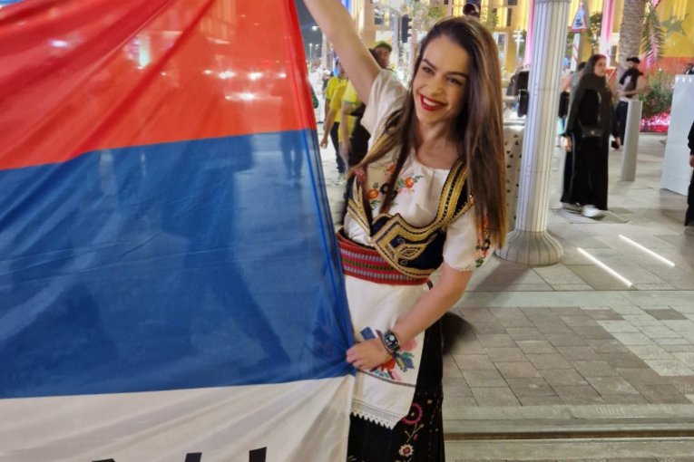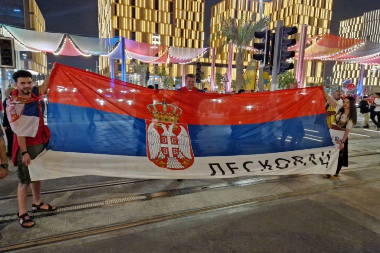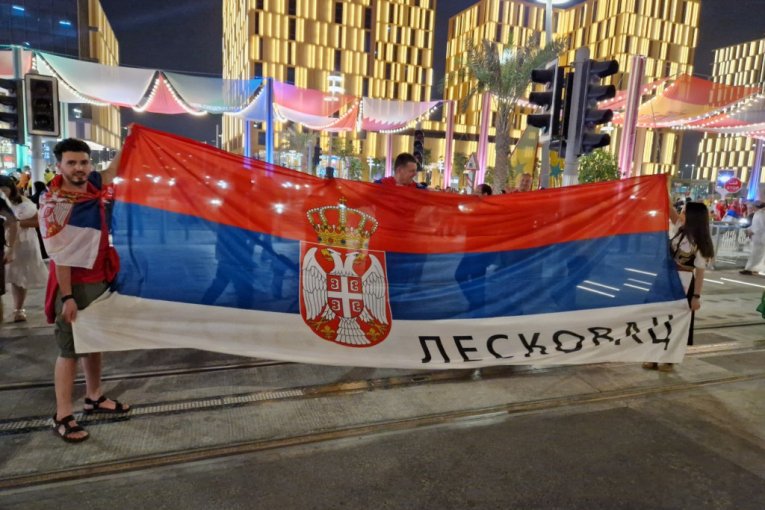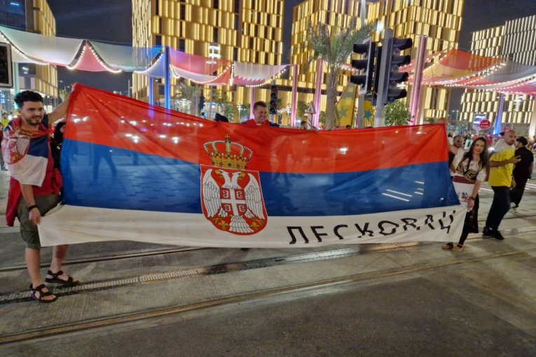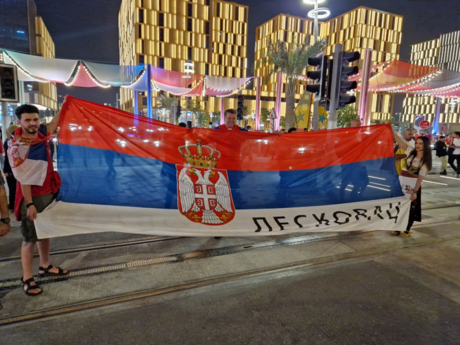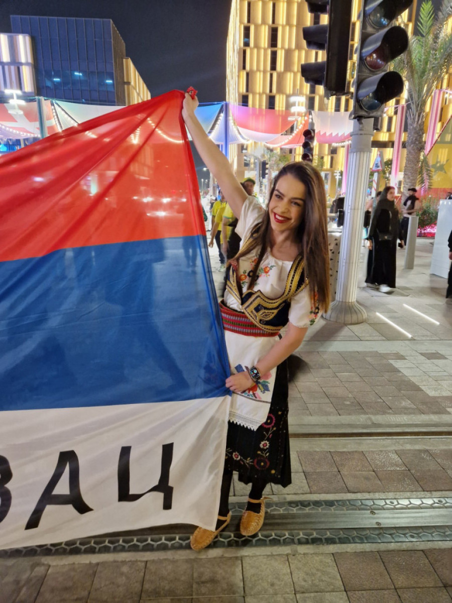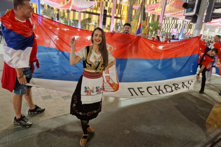 Ona je iskoristila priliku da u srpkoj narodnoj nošnji i našom zastavom na kojoj stoji "Leskovac" pošalje podršku Orlovima pred večerašnji duel na Lusail stadionu.