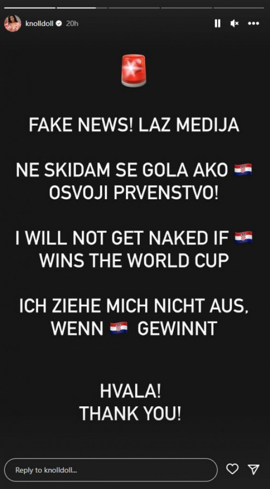 - Lažna vest, ne skidam se gola ako Hrvatska osvoji mundijal. Hvala - napisala je Ivana Knol na svom Instagram nalogu.
