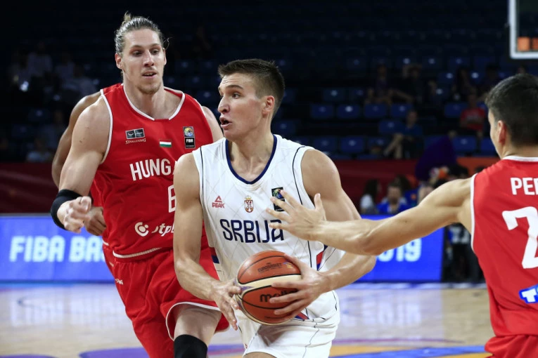 1. minut - Srbija sigurna. Keler je pogodio polaganje, a posle ukradene pa potom izgubljene lopte Jovića isti igrač Mađarske ponovo daje koš. Bogdanović je u međuvremenu postigao prve poene za Srbiju trojkom, 27:20. Foto: Tanjug/AP