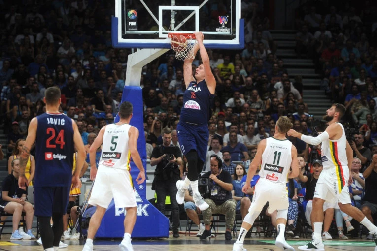 Foto: Tanjug/F. KRAINČANIĆPeto mesto na ovoj listi takođe pripada našoj reprezentaciji. Nikola Jokić je spustio loptu kroz šumu ruku do Nikole Milutinova, koji je zakucao loptu u koš.