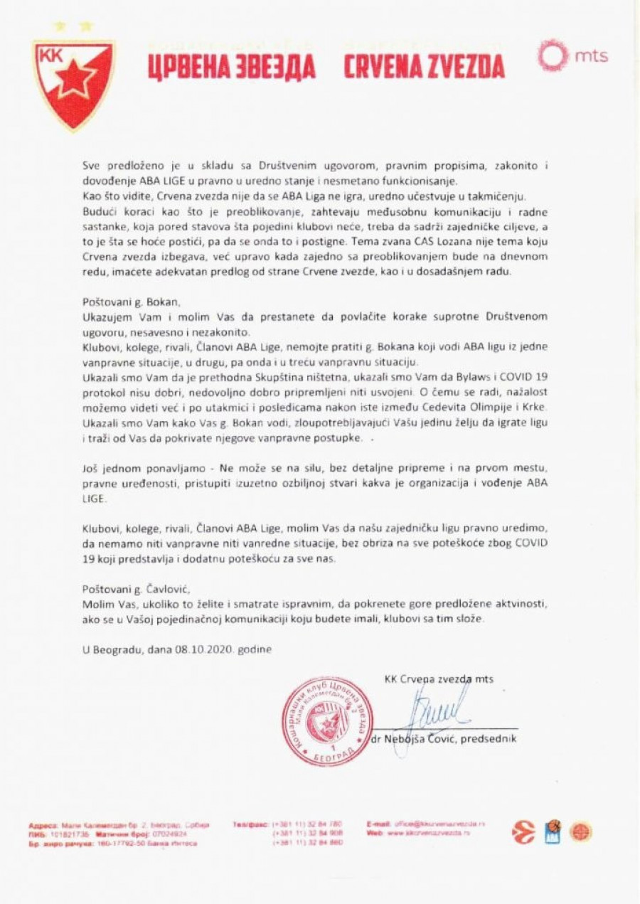 - KK Crvena zvezda mts obaveštava javnost da je predsednik KK Budućnost VOLI Dragan Bokan, ponovo dajući sebi ingerencije i prava koje mu nikako ne pripadaju, sazvao nelegalni sastanak klubova ABA lige, koji bi trebalo da se održi u 14 časova, zbog kako je navedeno „novonastale situacije u ABA ligi“. Među pozvanim klubovima se ne nalazi i KK Crvena zvezda mts. „Novonastala situacija“ je blokada računa ABA lige jtd u Zagrebu, od strane „Rajfajzen Banke“ sa sedištem u Zagrebu uz obrazloženje da će tako ostati do daljeg dok se „ne urede pravni akti lige“ koji podsećamo, nisu uređeni već 5 godina i zbog čega je KK Crvena zvezda mts i tužila ABA ligu 02.02.2020.godine! Podsećamo i da je u međuvremenu postignuto i vansudsko poravnanje (koje je KK Crvena zvezda mts već putem klupskog sajta dala na uvid javnosti) ali je ono propalo zbog opstrukcije predsednika KK Budućnost VOLI Dragana Bokana. Zato ovaj poziv Dragana Bokana vidimo kao još nelegalan i nezakonit korak suprotan svim aktima i pokušajima da pravno uredimo ligu koja je u vlasništvu svih klubova. Takođe, kao klub moramo da primetimo da ovakvu zabrinutost i brzinu nismo videli u poslednjih 15 meseci, kada je zbog istog razloga (neuređeni akti lige) 01.07.2019. godine blokiran račun ABA lige jtd u Beogradu, zbog čega je KK Crvena zvezda mts intervenisala u više navrata, tražila hitno uređenje lige i povratak u pravne okvire, jer novac kojim se finansira liga od njenog postojanja dolazi isključivo i jedino od TV prava –a to je novac koji dolazi iz Srbije. KK Crvena zvezda mts daje na uvid javnosti dopis koji je uputila 08.10.2020. godine svim klubovima ABA lige jtd, pa i KK Budućnost VOLI i Draganu Bokanu, u kome je zatražila hitno sazivanje Skupštine ABA lige i povratak zakonu i pravu, bez koga ABA liga neće opstati - navodi se u saopštenju. |