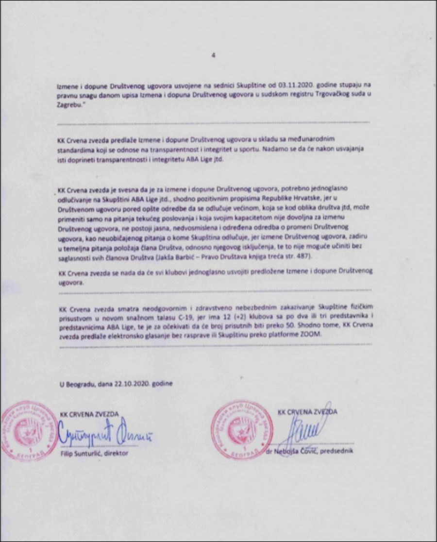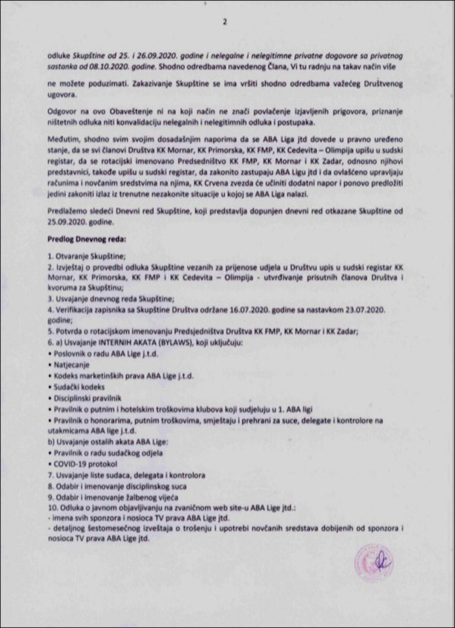 KK Crvena zvezda mts obaveštava javnost da je dana 20.10.2020. godine dobio poziv na sastanak, (u dopisu navedeno kao Skupština) svih klubova ABA lige jtd, koji bi trebalo da bude održan 03.11.2020. godine u Zagrebu, uz prisustvo predstavnika svih klubova.