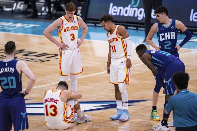 Užasna povreda Bogdana Bogdanovića (29)! Srpskom košarkašu stradalo je koleno u porazu Atlante od Šarlota (113:105) nakon što je u meču odigranom u noći između subote i nedelje izvrnuo nogu tokom jedne kontre. On je pao na parket i počeo da se previja od bolova, nakon čega su ga saigrači s terena izneli u svlačionicu.