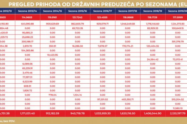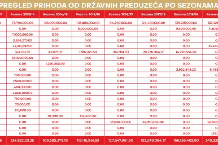 Te stavke (prihodi od RS, grada Beograda i državnih preduzeća) mogu se videti i kao odvojene tabele u okviru tabela br. 3 i br. 4 (suma i procentualni udeo učešća u prihodu kluba).