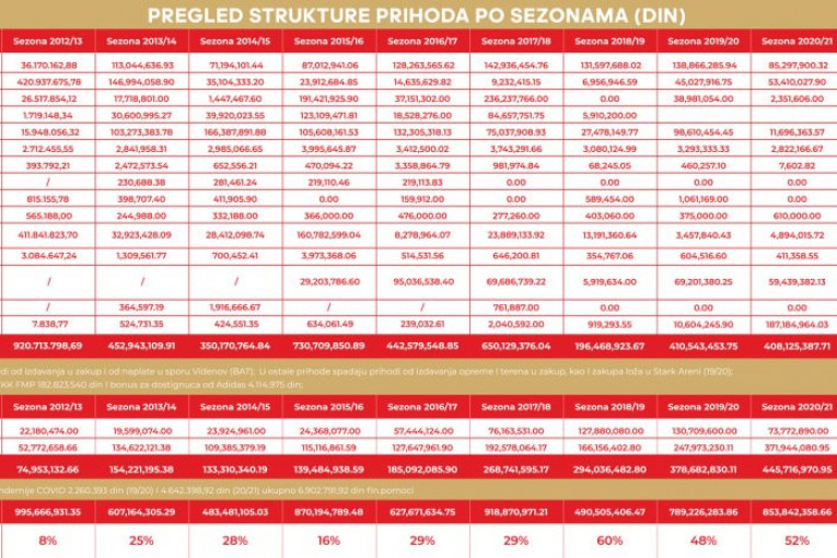 U tim izveštajima koji su od danas na raspolaganju svim Zvezdašima, ali i celokupnoj javnosti, nalaze se svi prihodi kluba (prikazani kroz period od 2011. godine i pojedinačno po sezonama) od državnih preduzeća, donacije (tabela 1 u dinarima i tabela 2 u evrima), kao i kompletna struktura prihoda od sponzora, donacija, prihoda od ulaznica, obeštećenja, takođe i prihodi od države, grada Beograda i njihov procentualni udeo u budžetu KK Crvena zvezda počev od 2011. godine kroz 12-godišnji period i pojedinačno za svaku od 11 sezona! (tabela 3 u dinarima i tabela 4 u evrima).