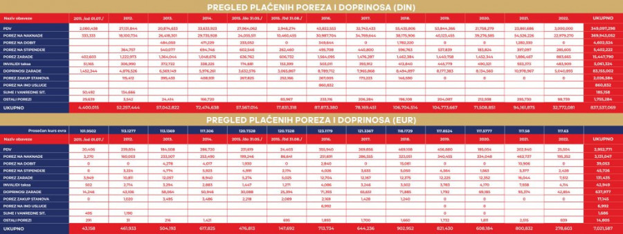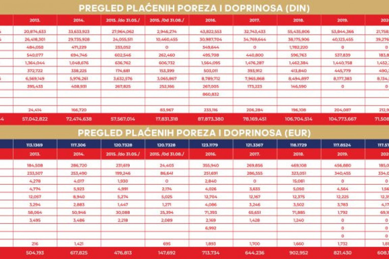 KK Crvena zvezda je sa druge strane na ime poreza (porez na naknade, dobit, doprinose, PDV-a, porez na plate zaposlenih…) u prethodnih 12 godina platio sumu od 837.537.069,00 dinara ili 7.021.587.00 evra! (Tabela br. 5)
