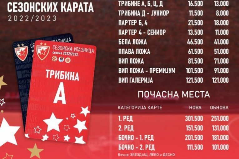 Klub podseća da je prodaja sezonskih ulaznica KK Crvena zvezda mts za takmičarsku sezonu 2022/2023 počela od utorka 28.06.2022. godine i prvobitno bila planirana da se okonča 11.07.2022.godine.