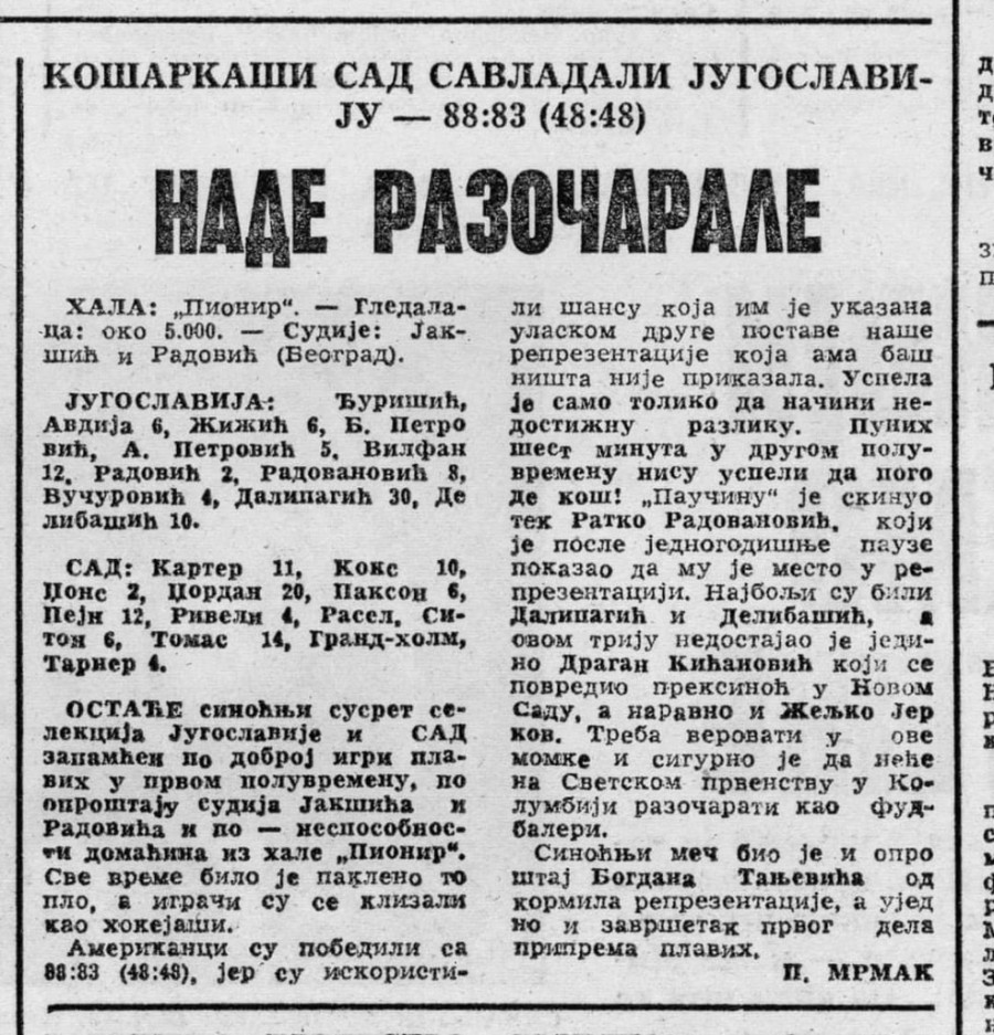 Beogradska dvorana "Pionir" togt leta 1982. godine bila je poprište duela jugoslovenske i američke nacionalne košarkaške reprezentacije.