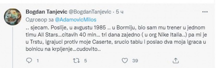 - Sećam. Posle, u avgustu 1985 .. u Bormiju, bio sam mu trener u jednom timu All Stars…čitavih 40 min… tri dana zajedno pa mi je u Trstu, igrajući protiv moje Kazerte, sručio tablu i poslao dva moja igrača u bolnicu na krpljenje - prisetio se Tanjević.