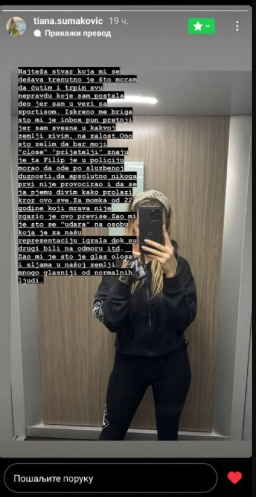 - Najteža stvar koja mi se trenutno dešava, je što moram da ćutim i trpim što sam u vezi sa profesionalnim sportistom. Iskreno me je briga što mi je inboks pun pretnji jer sam svesna u kakvoj, nažalost. Ono što želim da bar moji "bliski prijatelji" znaju da je Filip u policiju morao da ode po službenoj dužnosti, da apsolutno niko prvi nije provocirao i da se ja njemu divim kako prolazi kako prolazi kroz sve ovo - napisala je ona, pa dodala: