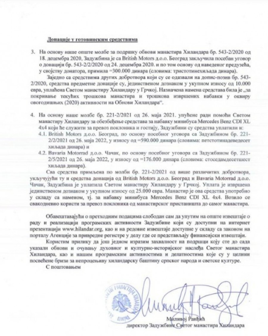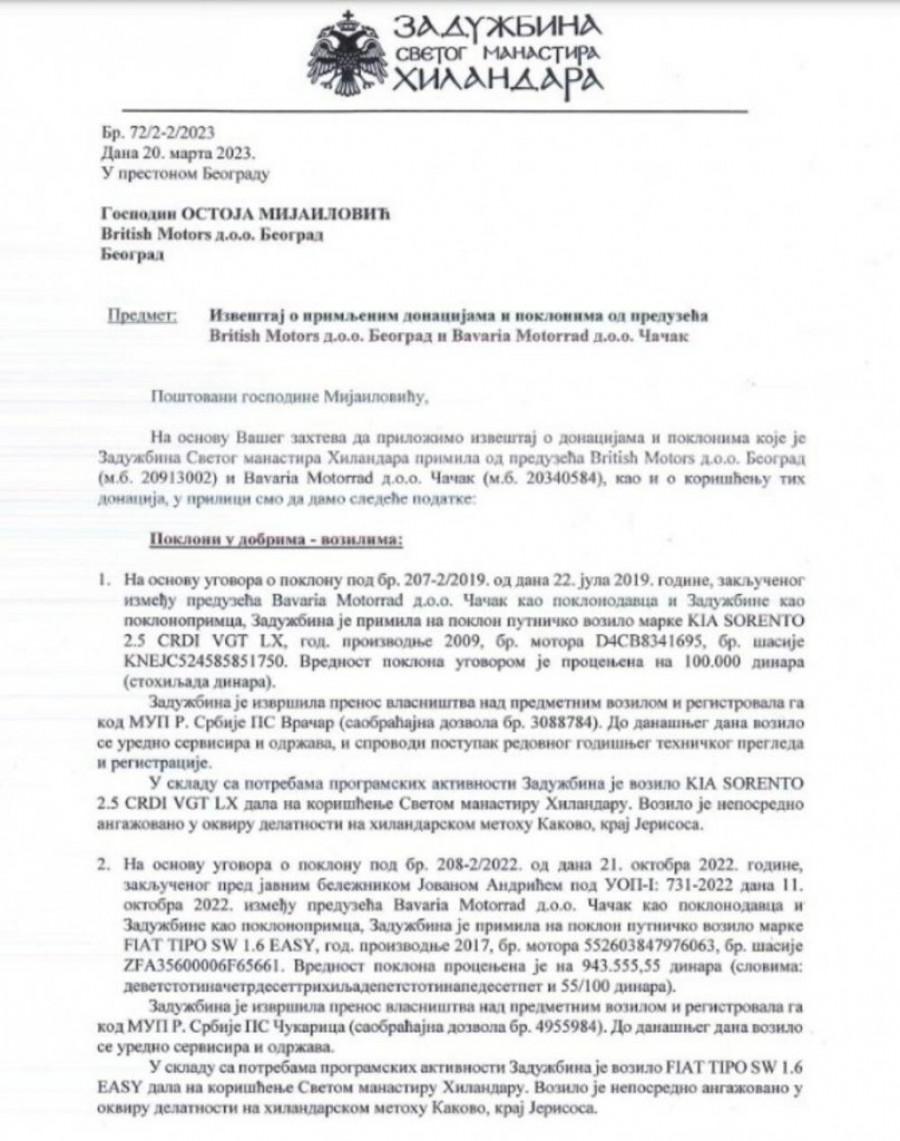 - Nikada se na temu donacija i pomaganja naših svetinja kao firma nismo oglašavali niti smo se time hvalili. Tako će biti i u budućnosti jer ćemo sigurno nastaviti da pomažemo našu svetinju, Manastir Hilandar. Ovaj dopis vam dajem na uvid samo zbog izrečenih kleveta da smo kao kompanija poklonili Manastiru ukradeni auto - rekao je Ostoja Mijailović i dodao: