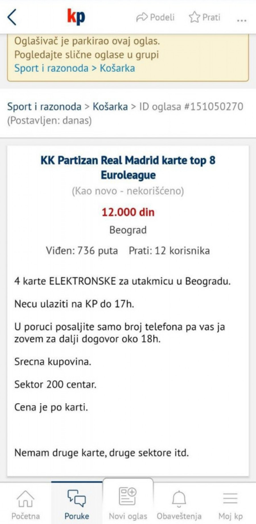 Ili ipak nije tako? Na popularnom sajtu "KupujemProdajem" se pojavio oglas, u kom se navodi da se karta za meč Partizana i Reala prodaje, i to po ceni od 12 hiljada dinara. Takođe, dodaje se da postoji četiri karte za ovaj meč, tako da vlasnik ulaznica na ovome može da profitira čak 48.000.