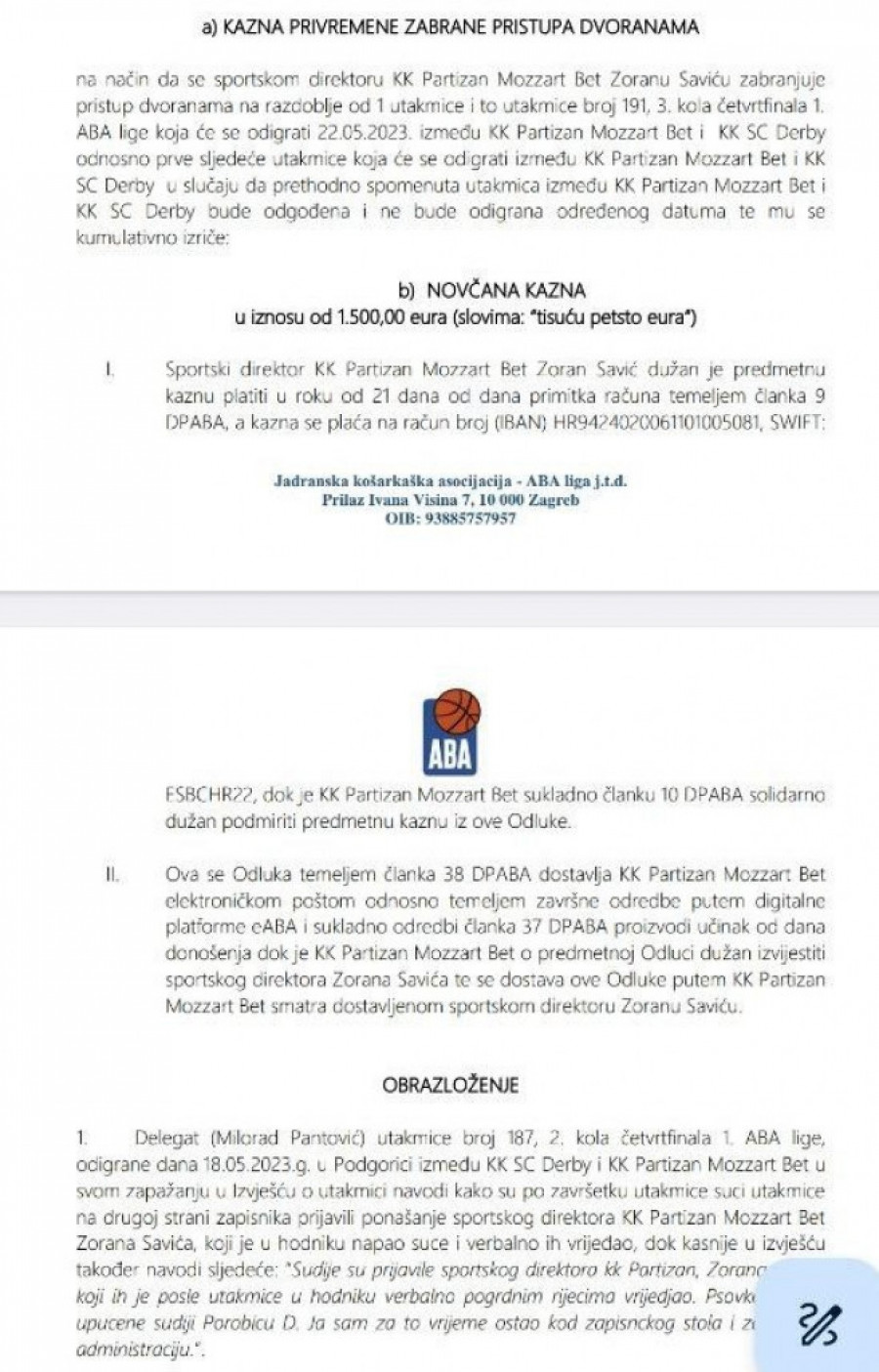 - Sportskom direktoru KK Partizan Mozzart Bet zabranjuje se pristup dvoranama na razdoblje od jedne utakmice i to u utakmici broj 181, trećeg kola četvrtfinala ABA lige koja će se odigrati 22.5.2023 između KK Partizan Mozzart Bet i KK Studentski centar Derbi...