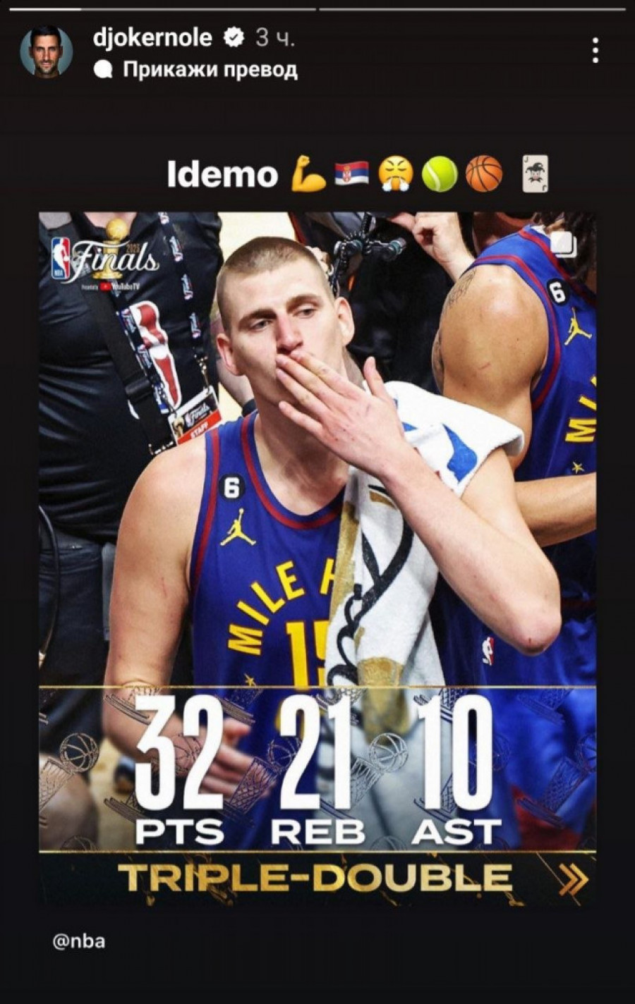 Srbin je monstruoznom partijom vodio svoj tim do nove pobede, a šansu da mu čestita nije propustio ni Novak Đoković, najbolji teniser svih vremena, koji je podeli objavu NBA lige, a zatim napisao "Idemo!"