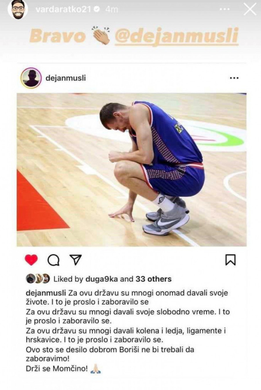 Njegovu poruku podržao je još jedan bivši igrač Partizana Ratko Varda, koji je podelio Muslijev status uz komentar: