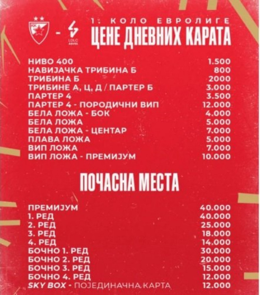 Prodaja pojedinačnih karata za utakmice KK Crvena zvezda Meridianbet protiv ASVEL-a i Cedevita Olimpije (08.10.2023) počinje istovremeno u ponedeljak tačno u 10 časova i to po sledećim cenama: