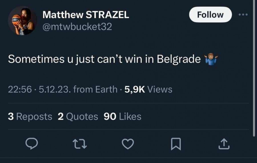 - Ponekad jednostavno ne možemo pobediti u Beogradu - napisao je Metju Strazel.