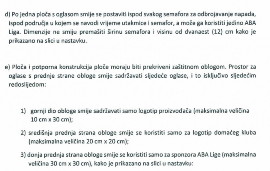 - Po jedna ploča s oglasom sme se postaviti ispod svakog semafora za odbrojavanje napada, ispod područja u kojem se navodi vreme utakmice i semafor, a može ga koristiti jedino ABA liga. Dimenzije ne smeju premašiti širinu semafora i visinu od 12 centimetara - stoji u pomenutom članu.