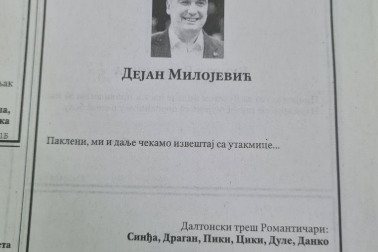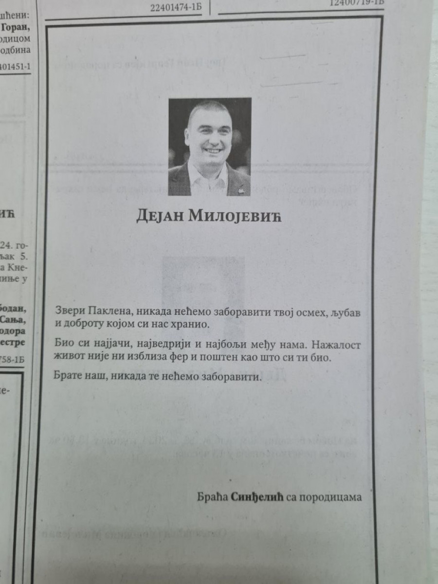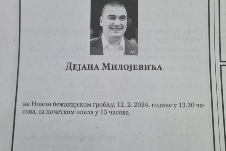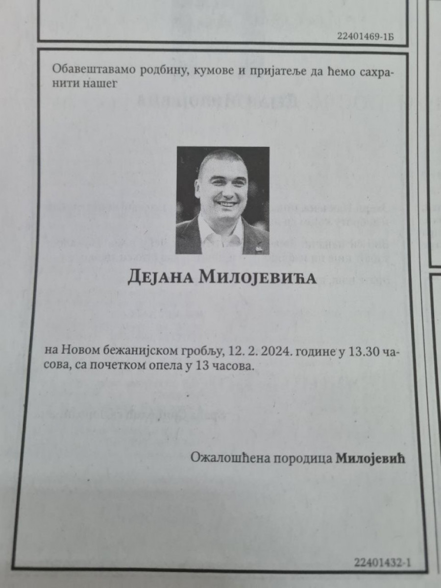 - Obaveštavamo rodbinu, kumove i prijatelje da ćemo sahraniti našeg Dejana Milojevića na Novom bežanijskom groblju, 12. 2. 2024. godine u 13.30 časova, sa početkom opela u 13 časova - navela je ožalošćena porodica Milojević.