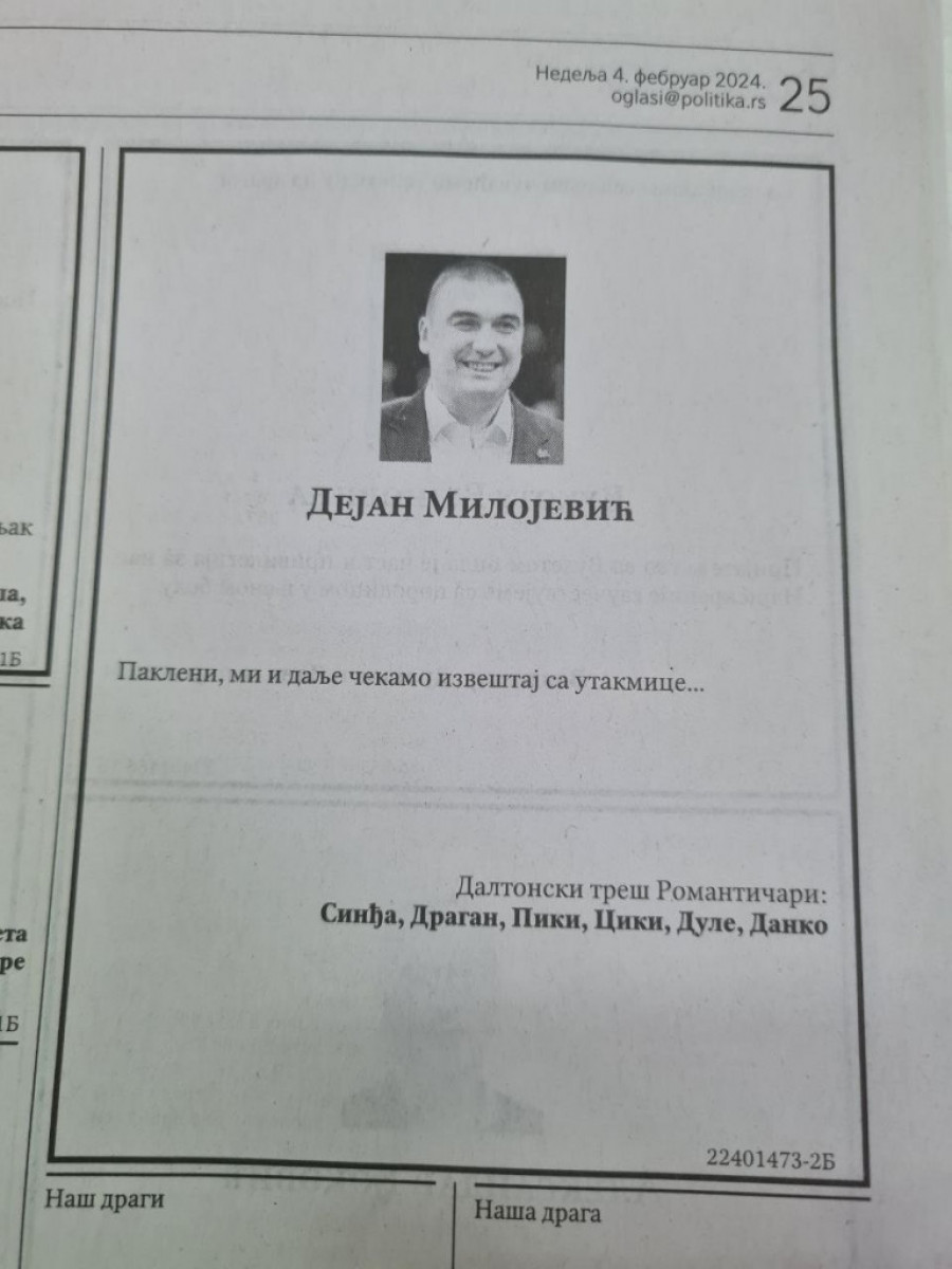 U današnjem (nedelja, 4. februar) izdanju dnevnog lista "Politika", porodica Dejana Milojevića dala je čitulju.