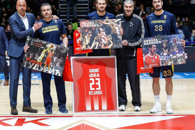 Košarkaški klub Crvena zvezda uručio je poklone bivšim igračima crveno-belih Nikoli Kaliniću i Marku Guduriću, kao i kondicionom treneru Predragu Bati Zimonjiću, koji su sada članovi Fenerbahčea.