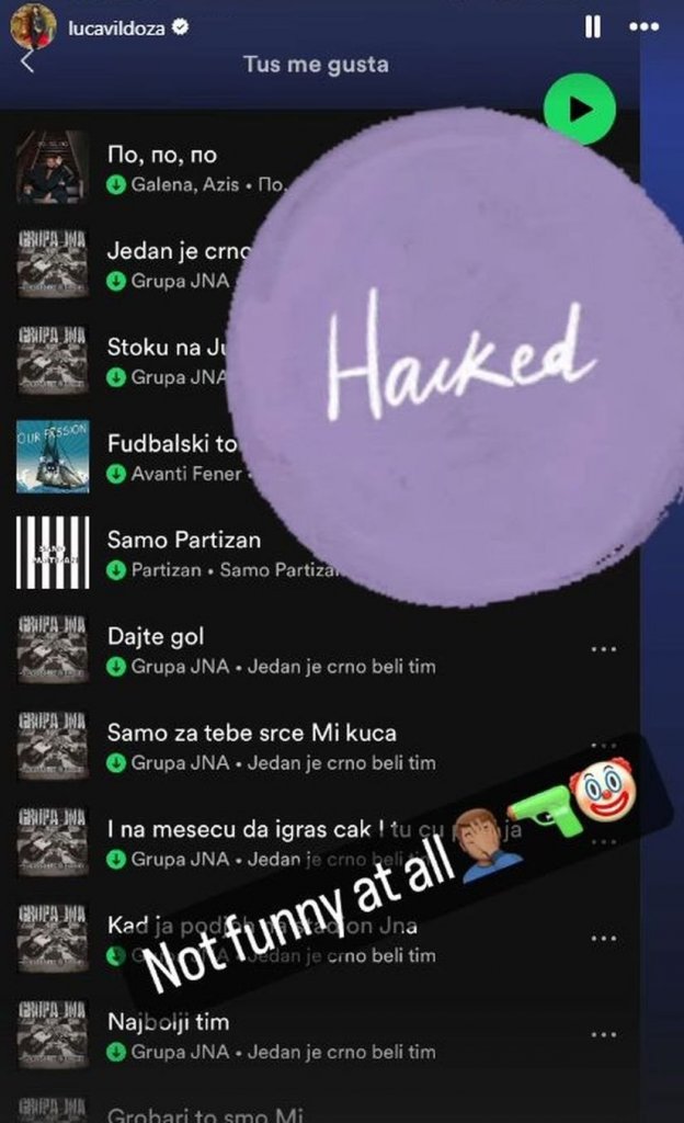 Tako se bek PAO "pohvalio" na društvenim mrežama kako mu sada izgleda nalog na Spotify. Naime, on se očigledno našao na udaru nekog od navijača Partizana koji su uspeli da mu hakuju nalog i okače mu sve grobarske pesme u plejlistu. U pitanju su pesme vezane za Partizan i to uglavnom od grupe JNA.