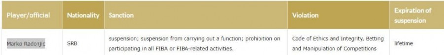 Marko Radonjić, srpski košarkaš, suspendovan je doživotno od strane svetske košarkaške organizacije (FIBA) zbog nameštanja.