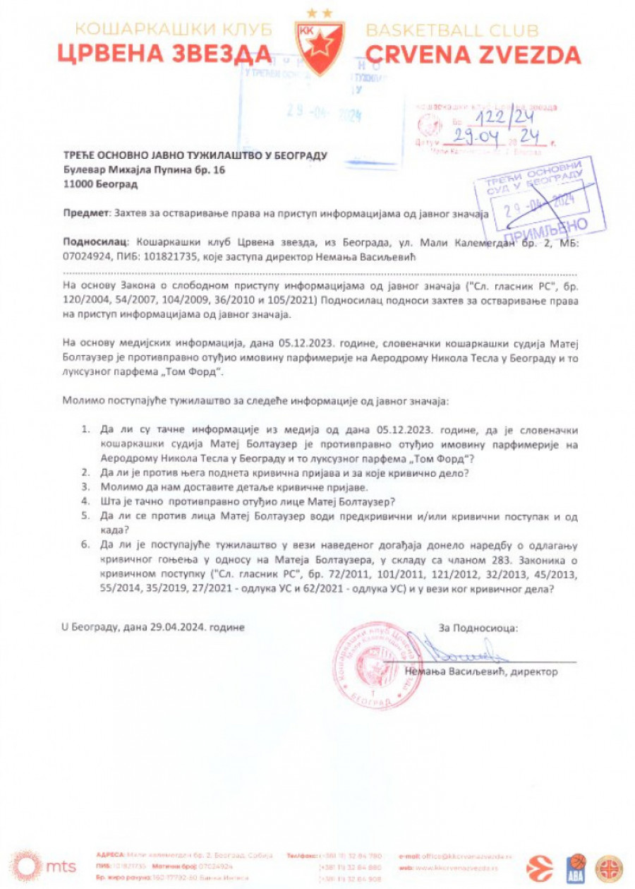- KK Crvena zvezda obaveštava javnost da je u utorak 30.04.2024. godine dobio zvaničnu potvrdu o “slučaju Boltauzer”. U prilogu se nalaze zvaničan zahtev KK Crvena zvezda Trećem Osnovnom Javnom Tužilaštvu