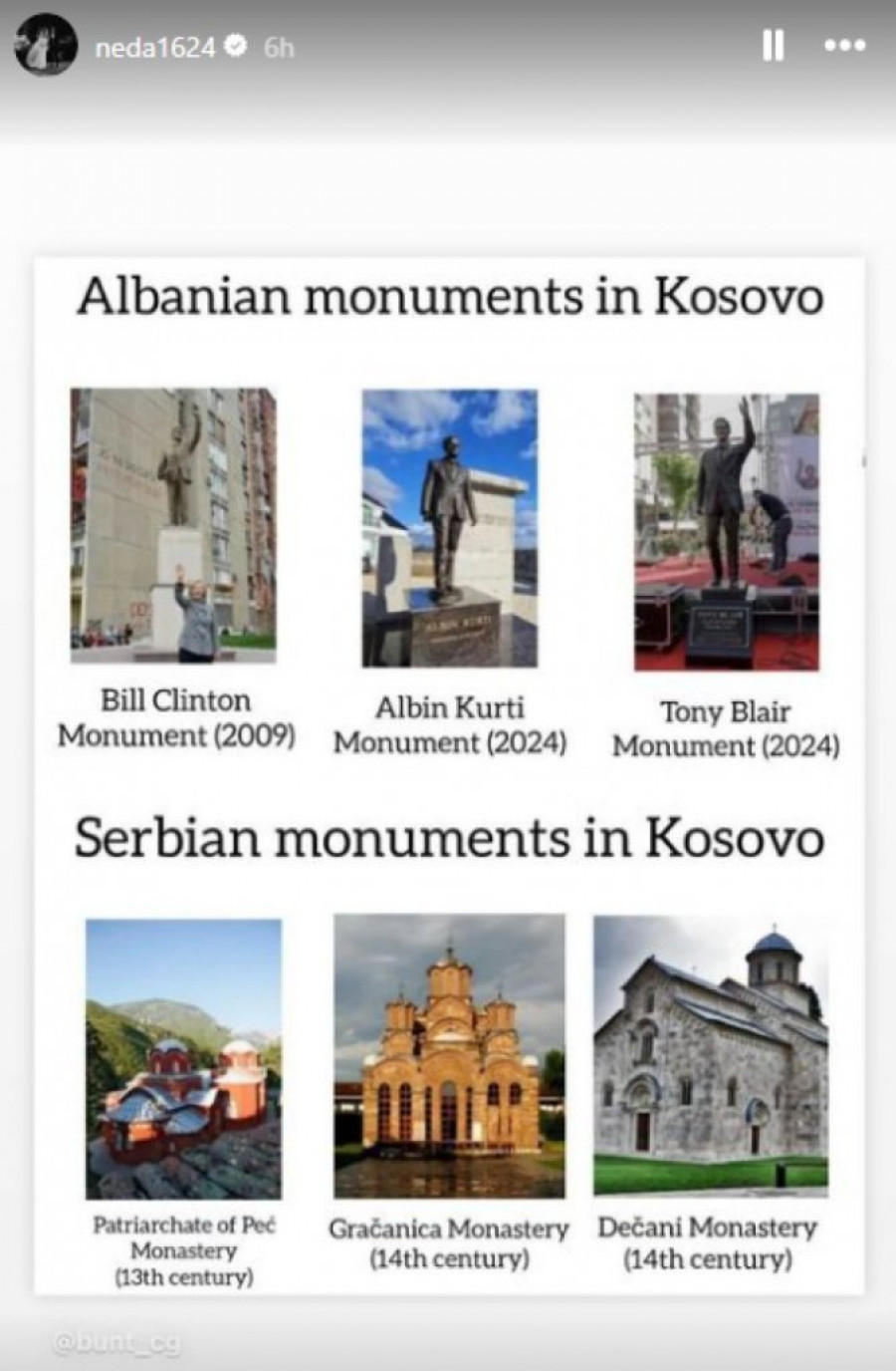 Nedović je na Instagramu objavio fotografiju koja jasno pokazuje da je Kosovo deo Srbije, ističući da su istorijski manastiri poput Gračanice, Dečana i Pećke patrijaršije dokazi koji potvrđuju tu činjenicu. U isto vreme, istakao je nedostatak istorijske i kulturne baštine kod šiptarskog stanovništva, naglašavajući spomenike kao što su oni posvećeni Bilu Klintonu, Albinu Kurtiju i Toniju Bleru.