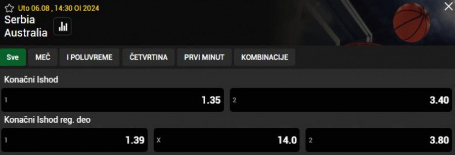 Verovatno i na osnovu navedenih ostvarenja kladionice su iznele kvote za predstojeći meč, a kako ističe "SoccerBet" reprezentacija Srbije jeste apsolutni favorit da se nađe u polufinalu. Kvota na izabranike selektora Svetislava Pešića iznosi 1,35, dok je kvota na trijumf Australije 3,40.