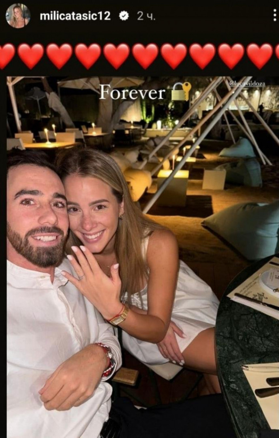 Argentinski košarkaš Luka Vildoza odlučio je da zakorači u novu životnu fazu i zatraži ruku svoje dugogodišnje devojke Milice Tasić. Ova romantična gesta nije mogla proći neprimećeno, pa je Milica podelila vest sa svojim pratiocima na društvenim mrežama uz emotivan komentar "Zauvek".