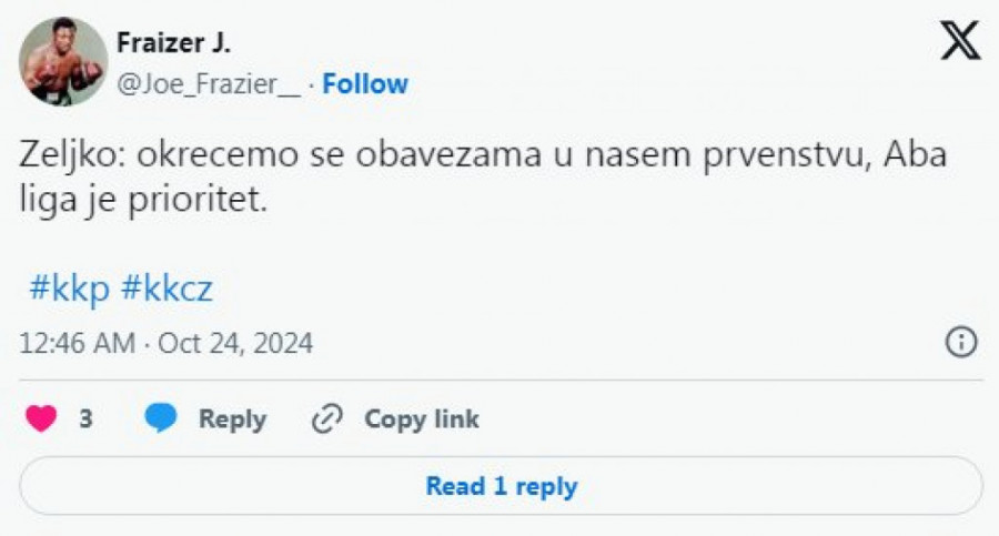 - Imali smo problem u skoku, s tim što je u prvoj četvrtini bilo sedam, pa smo u drugoj kontrolisali. Slažem se da je to bio problem. Radimo na tome i radićemo na tome. Postoji nešto što je važno, a to je da se pokaže želja da se uzme skok. Što se napada tiče, mislim da su bile neke sitauacije gde smo dobro odigrali, ali suština je da će ljudi pamtiti samo poslednji napad i odbranu. Hvala ovim ljudima na fantastičnoj atmosferi - analizirao je Žoc meč.