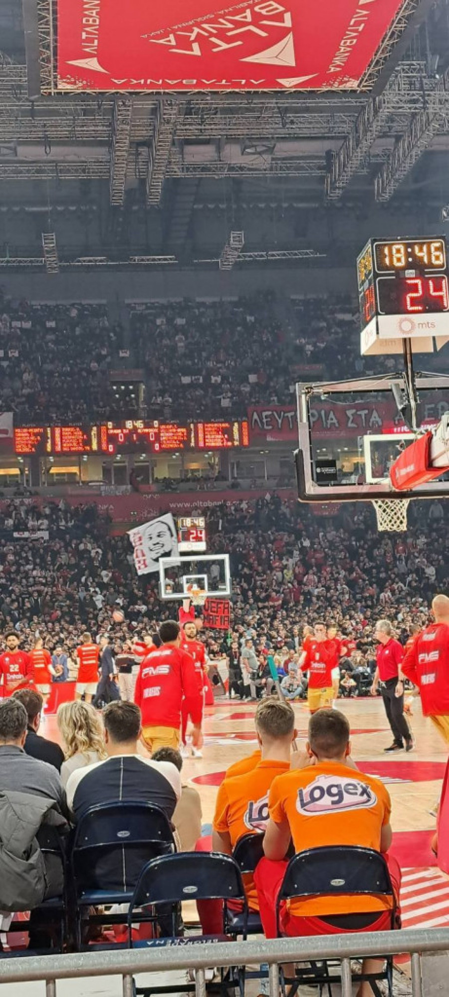 Košarkaši Crvene zvezde Meridianbet igraju od 20.30 protiv Olimpijakosa u 15. kolu Evrolige. Imaju izabranici Janisa Sferopulosa veliku podršku delija u dupke punoj hali gde je prava crveno-bela fešta. "Delije" su najavile toplu bratsku dobrodošlicu za Olimpijakos, koreografiju, a to se i desilo. Cela hala je pred meč postala crveno-bela i to tako što su se na podignutim papirima u pomenutim bojama nalazili grbovi "Gejt 7", glavne navijačke grupe Olimpijakosa, a navijači su pevali za oba kluba, na srpskom i grčkom jeziku.