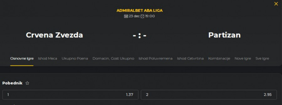 Uoči meča i kladionice procenjuju ko je bliži večerašnjm trijumfu. Kvote AdmiralBet kladionice jasno govore da je aktuelni srpski i regionalni šampion, favorit u predstojećem duelu. Kvota na pobedu crveno-belih iznosi 1,37, dok će svako ko uloži jedan dinar na trijumf Partizana, ukoliko do njega i dođe, inkasirati 2,95.