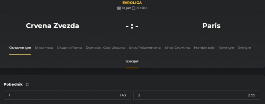 Naime, na sat vremena pre početka meča kvota na trijumf Crvene zvezde Meridianbet iznosi 1,43, dok će svako ko uloži jedan dinar na trijumf Parižana, pod uslovom da do njega i dođe, inkasirati 2,95.