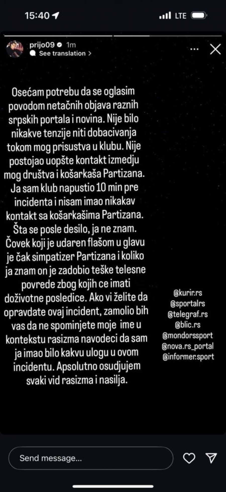- Osećam potrebu da se oglasim povodom netačnih objava raznih srpskih portala i novina. Nije bilo nikakve tenzije niti dobacivanja tokom mog prisustva u klubu. Nije postojao uopšte kontakt izmedju mog društva i košarkaša Partizana. Ja sam klub napustio 10 min pre incidenta i nisam imao nikakav kontakt sa košarkašima Partizana. Šta se posle desilo, ja ne znam. Čovek koji je udaren flašom u glavu je čak simpatizer Partizana i koliko ja znam on je zadobio teške telesne povrede zbog kojih ce imati doživotne posledice. Ako vi želite da opravdate ovaj incident, zamolio bih vas da ne spominjete moje ime u kontekstu rasizma navodeci da sam @mondorssport ja imao bilo kakvu ulogu u ovom incidentu. Apsolutno osudjujem svaki vid rasizma i nasilja - rekao je Prijović.