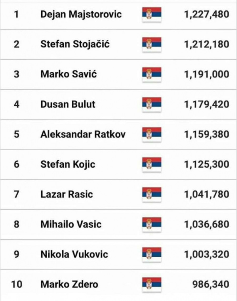 Na listi najboljih basketaša na svetu prvih deset mesta zauzimaju igrači iz Srbije! Prvi je Dejan Majstorović, drugi Stefan Stojačić, treći Marko Savić...