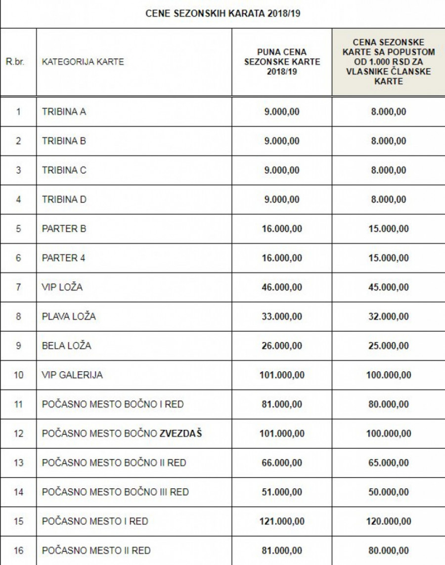 Prodaja sezonskih ulaznica počinje od ponedeljka 3.septembra i trajaće 30 dana. Sezonske karte će se, prodavati po, izuzetno povoljnim cenama, a vlasnici članskih karata KK Crvena zvezda mts imaće dodatni popust od 1000 dinara: