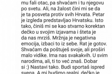 - Brate, ne mrzim nikoga. Iskreno i od srca ti ovo govorim. Ko je prema meni dobar, ja ću biti 10 puta bolji prema njemu. Ko poštuje moju zemlju i moj dom zaslužuje od mene samo još veci respekt. Rat je gotov, mržnju niko ne širi niti gaji u duši. Iskren pozdrav za Zagreb! - napisao mu je Veljko.