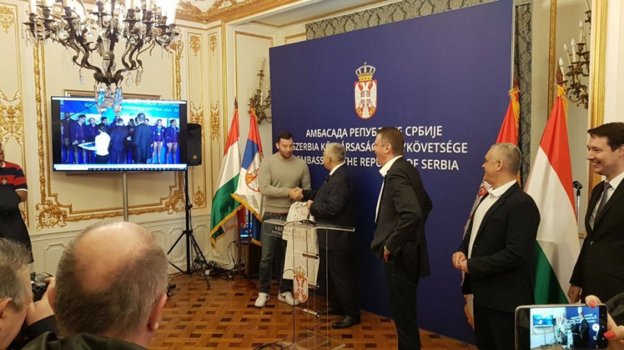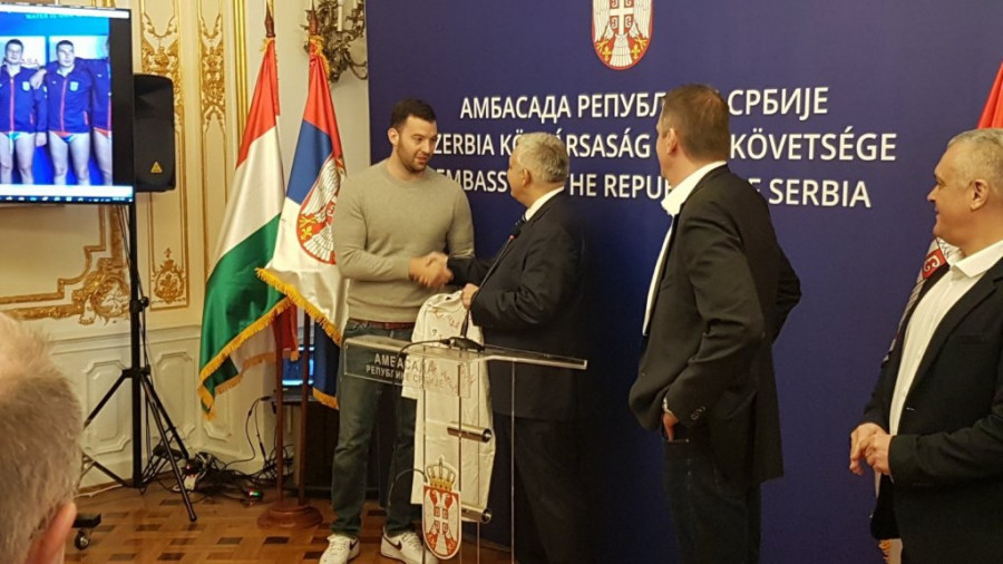 Tom prilikom ispred vaterpolista Srbije Filip Filipović je ambasadoru poklonio majicu sa potpisom svih igrača.