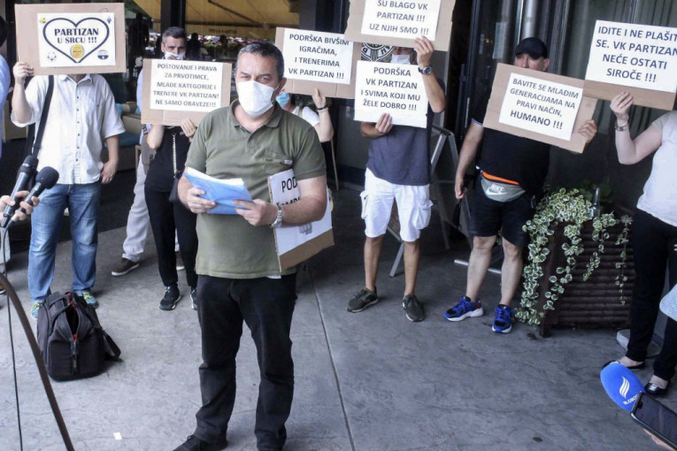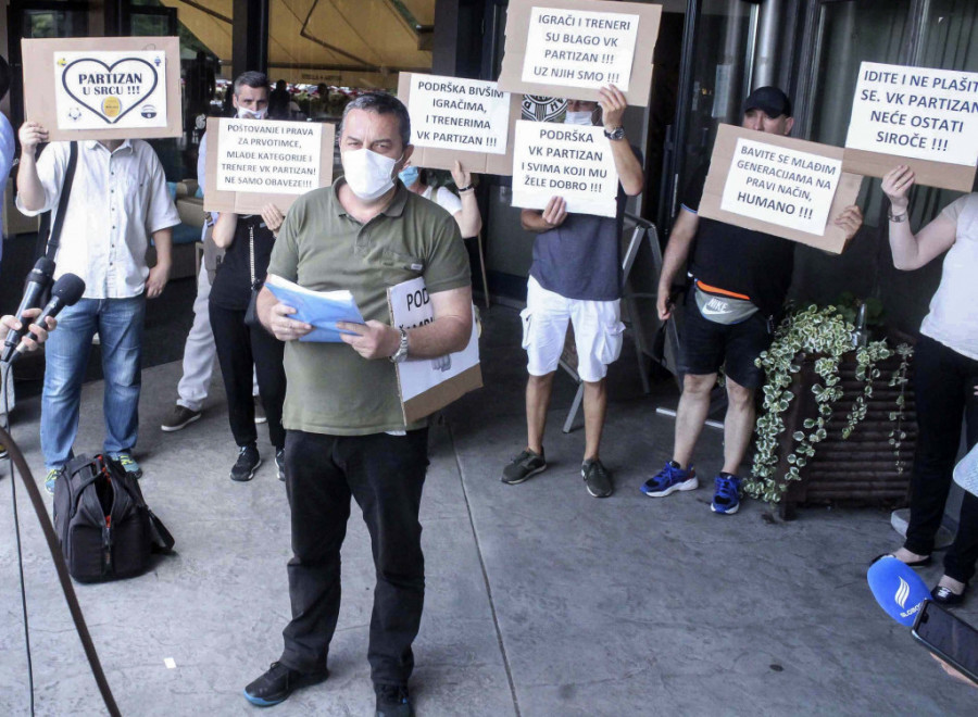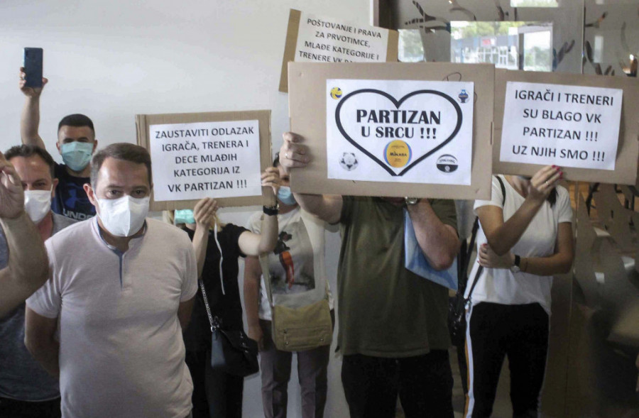 Roditelji dece koja treniraju u klubu okupili su se na Banjici i lupajuću u staklo, uz povike "Uprava napolje" i "Hoćemo promene" prekinuli konferenciju za medije.