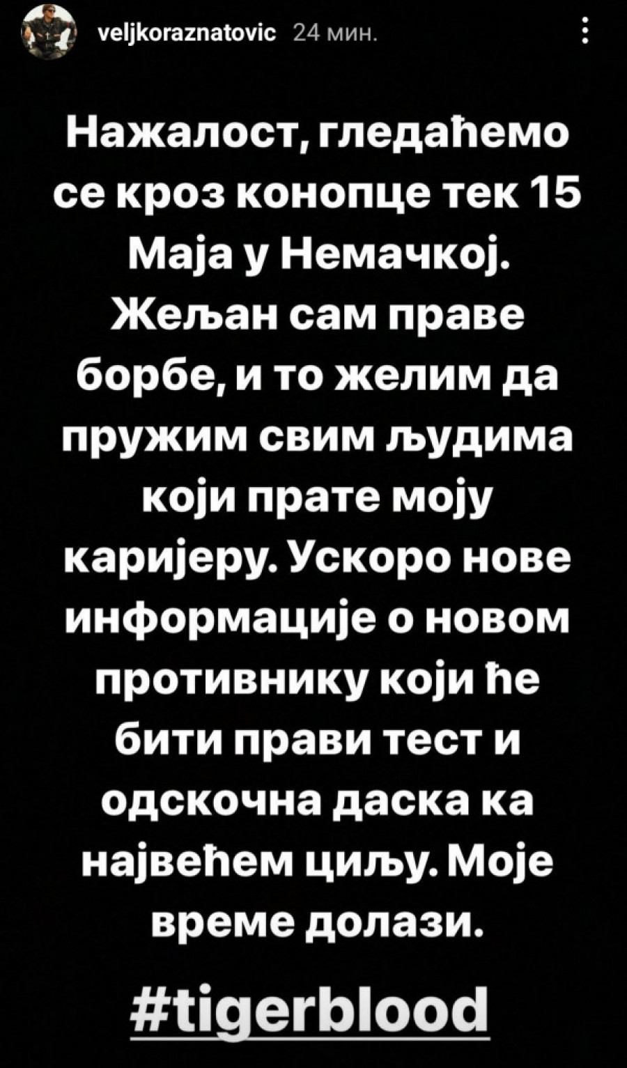 - Lično sam odbio da radim meč sa tim kalibrom boksera! Gledaćemo se kroz konopce tek 15. maja u Nemačkoj. Željan sam prave borbe i to želim da pružim svim ljudima koji prate moju karijeru. Novi protivnik će biti pravi test i odskočna daska ka najvišem cilju. Nastavljam pripreme pod budnim okom Vitalija Slavnova i Alana Čehoeva u “Arijana boksing timu”, koji je proizveo osam prvaka sveta - izjavio je Ražnatović uz poruku: