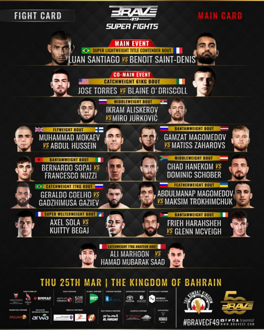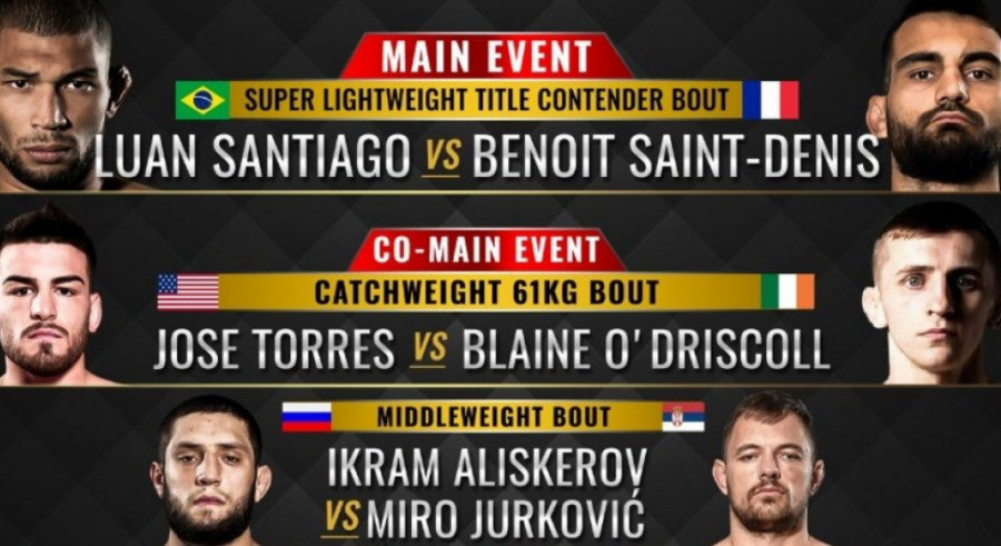 U borbi večeri sastaće se Brazilac Luan Santjago, bivši svetski prvak u lakoj kategoriji, i neporaženi borac iz Francuske Beno Sen Deni, poznatijim kao "Bogom rata".