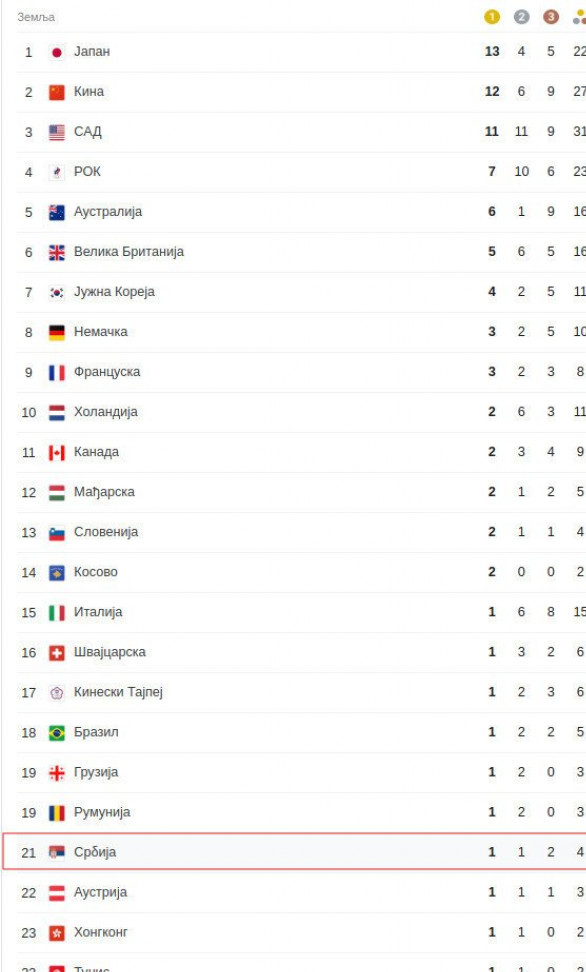Srbija u ovom trenutku zauzima 21. mesto na tabeli najuspešnijih zemalja u Tokiju, dok bi u slučaju zlatne medalje u basketu delila 13. poziciju sa Slovenijom.