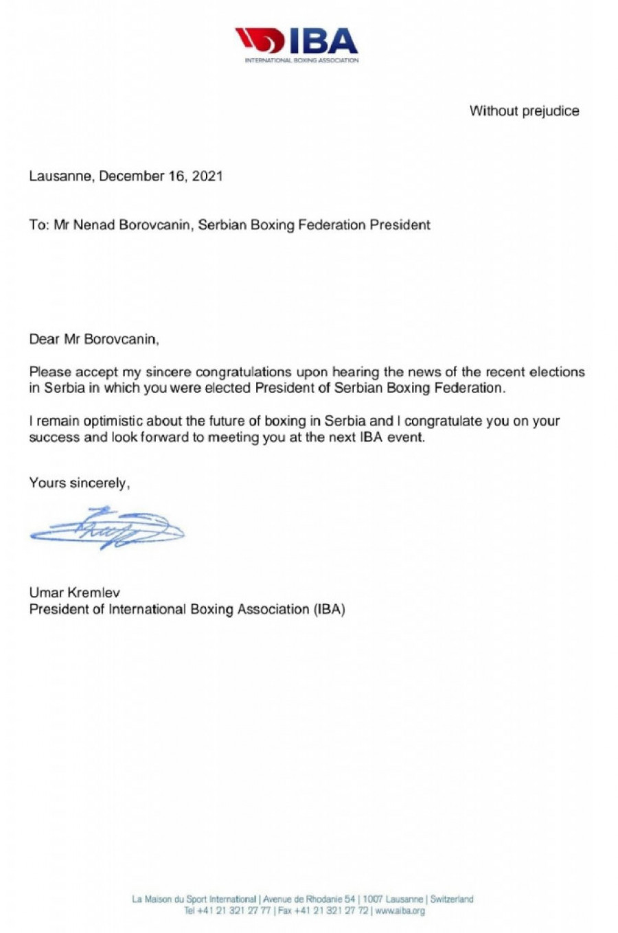 Izražavam svoj optimizam povodom budućnosti srpskog boksa, budućih uspeha, a jedva čekam da se sretnemo na narednom IBA događaju - navedeno je u čestitci.