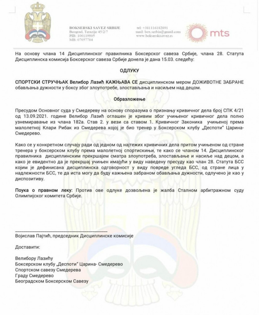 - Nakon nalaza Antidoping agencije Srbije i pozitivnog rezultata na nedozvoljenu supstancu FUROSEMID, prema domaćim i međunardnim propisima, treneru Miliću izrečena je mera zabrane obavljanja tenerskog posla. Ista mera odnosi se i na nedolično ponašanje Milića prema bokserskoj sudinici međunarodnog zvanja, tokom održavanja takmičenja u Beogradu prošle godine. Njegov kolega Velibor Lazić kažnjen zbog polnog uznemiravanja maloletne sportistkinje, sto je potvrđeno presudom Osnovnog suda u Smederevu - stoji u saopštenju Bokserskog saveza Srbije i dodaje se: