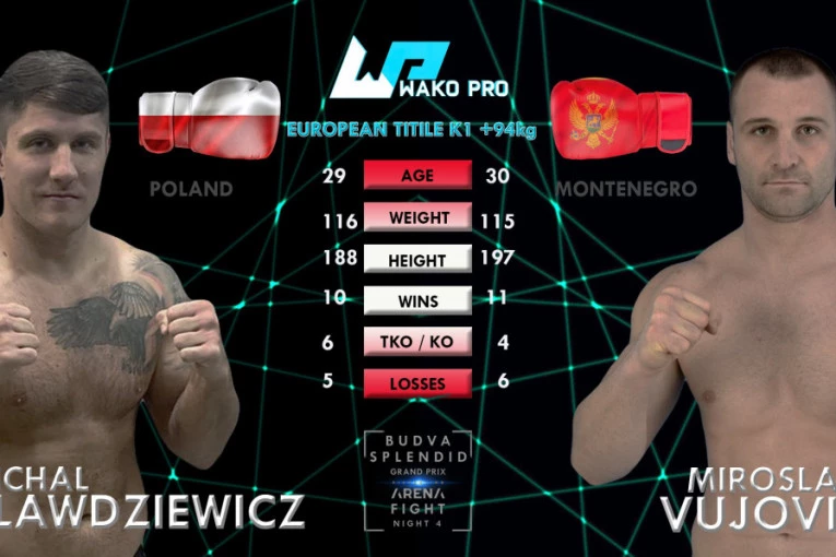 Meč večeri za Wako Pro K1 evropsku titulu između Crnogorca Vujovića i Poljaka Blavdiviča planiran je za sutra u 22 sata, uz direktan prenos na kanalima Arena Fight i Adria TV.